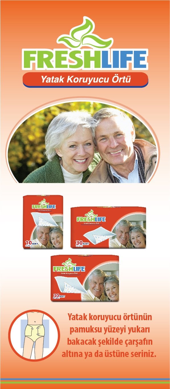 Freshlife Yatak Koruyucu Örtü 90x180 cm, Sıvı Geçirmez, Yüksek Emici, 30 Adet Freshlife Yatak Koruyucu Örtü 90x180 cm, sıvı geçirmez ve yüksek emici yapısıyla yatağı korur. Hasta, yaşlı ve bebek bakımı için idealdir. 1321451